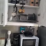 На оборудованной кухне имеется бытовая техника, включая электрочайник, духовку и стеклянную посуду.